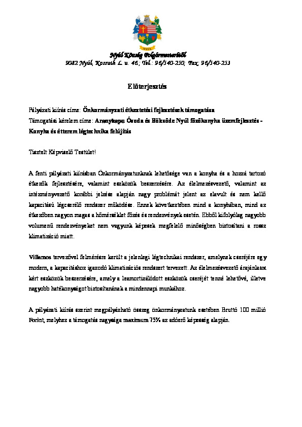 Önkormányzati étkeztetési fejlesztések pályázat - előterjesztés konyhafejlesztés