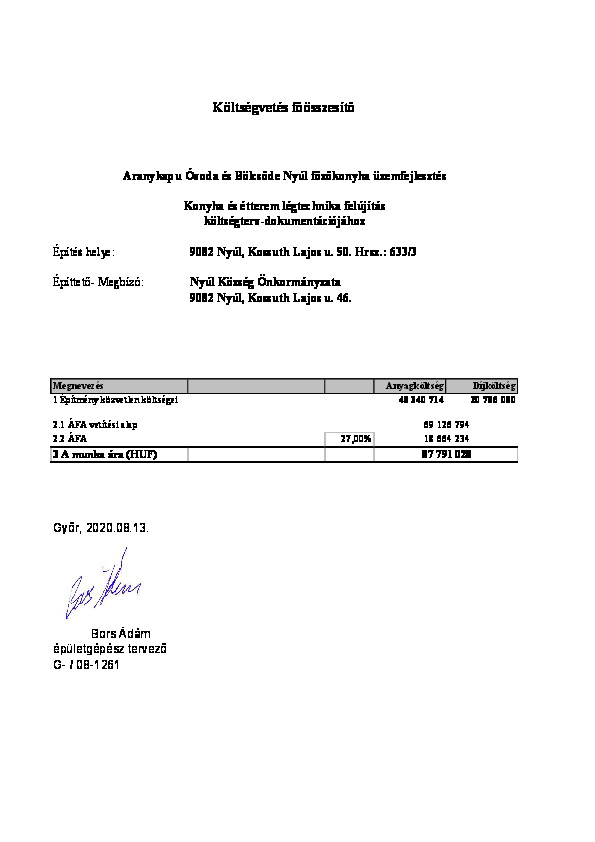 Önkormányzati étkeztetési fejlesztések pályázat - Épületgépészet költségkalkuláció