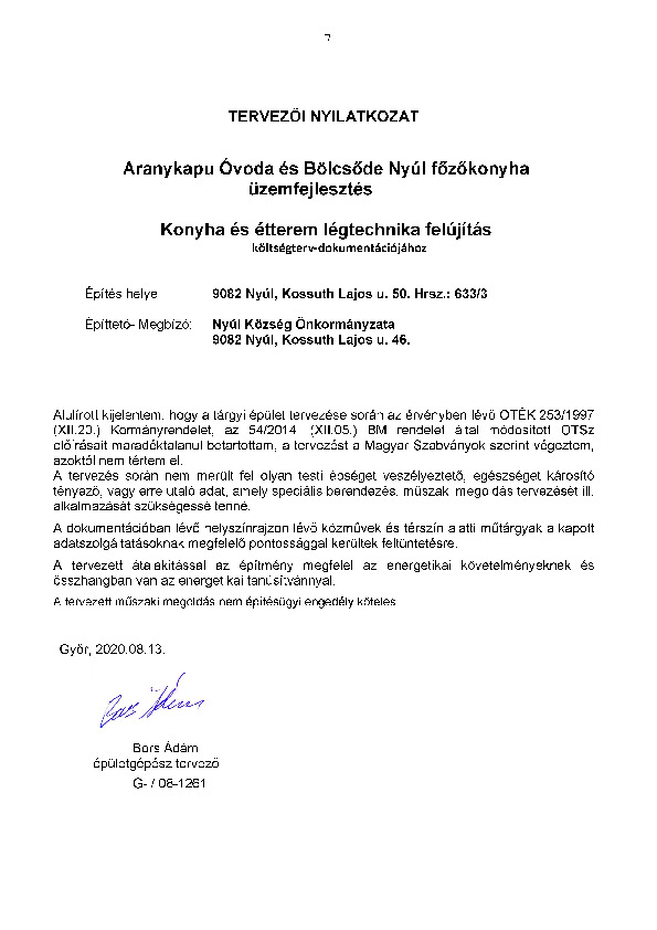 Önkormányzati étkeztetési fejlesztések pályázat - Műszaki leírás és tervezői nyilatkozat
