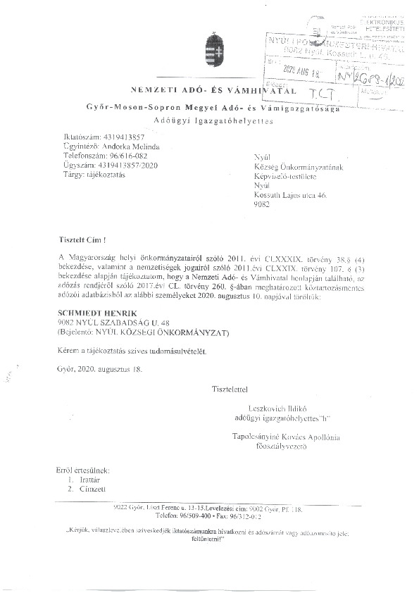 Köztartozásmentes adózói adatbázisból törlésről tájékoztatás - érintett SH pm