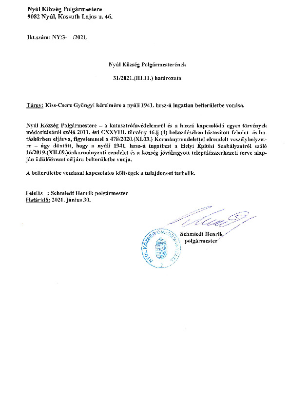 Polgármesteri határozat - TT21301 msz-ú rendezési terv módosítás partnerségi egyeztetés lezárása