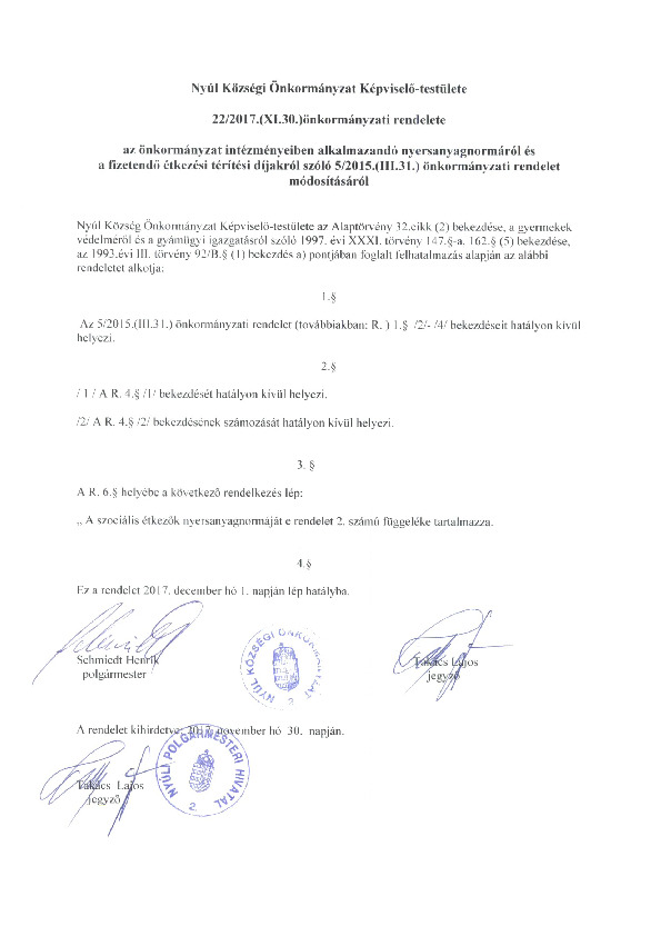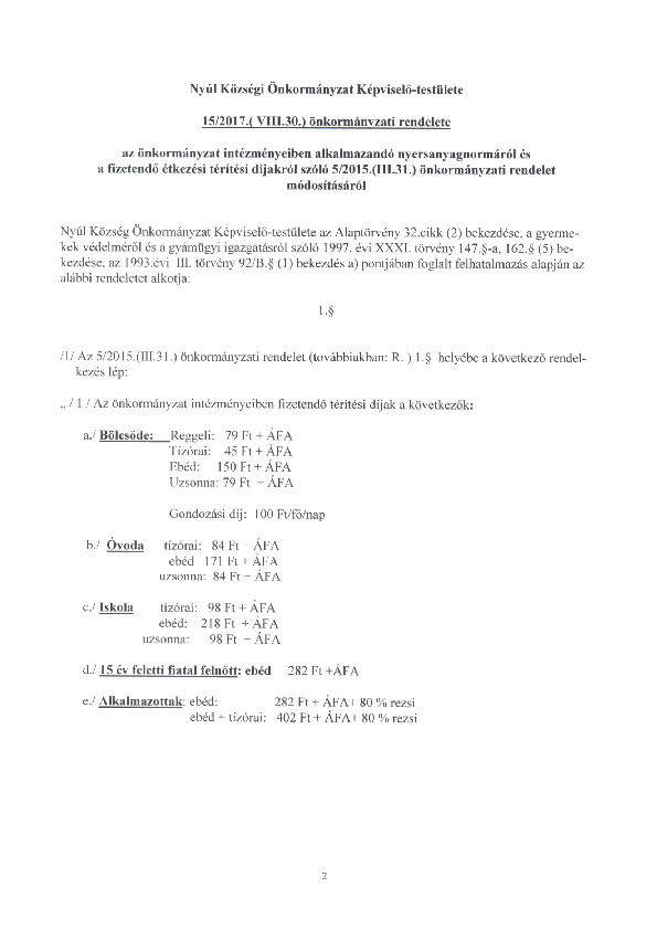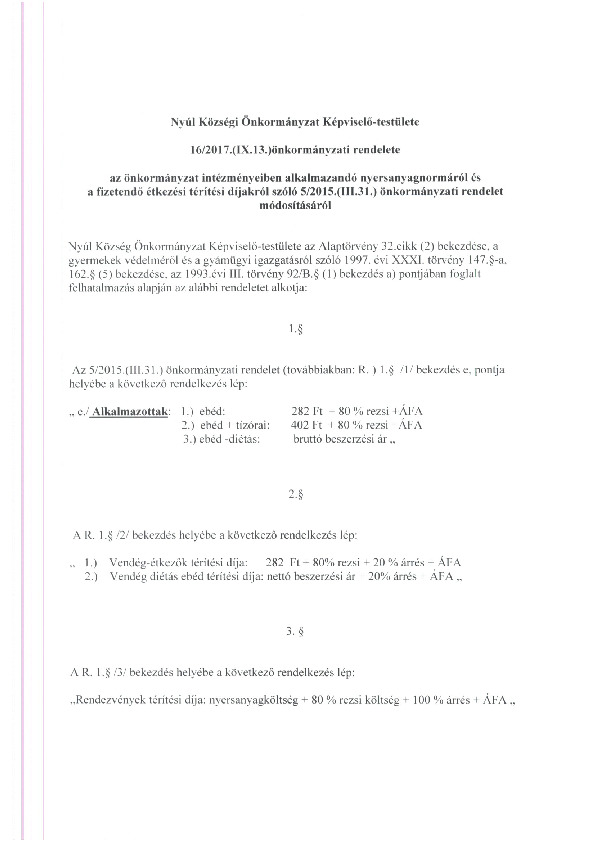 Önkormányzat intézményeiben alkalmazandó nyersanyagnormáról és térítési díjról szóló rendelet mod.