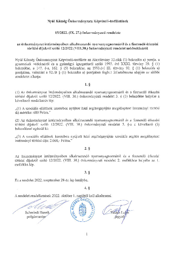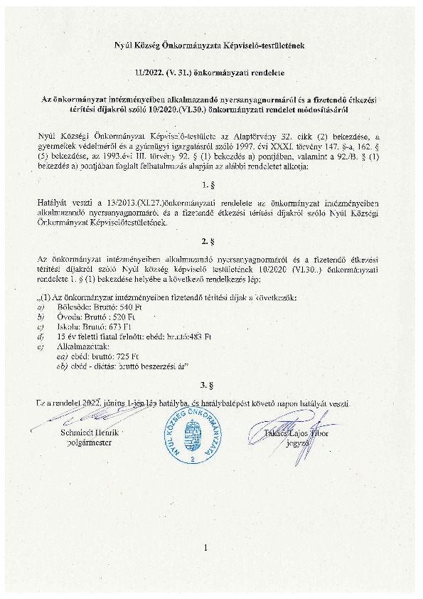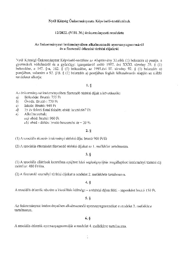 Az önk. intézményeiben alkalmazandó nyersanyagnormáról és a fizetendő étkezési térítési díjakról