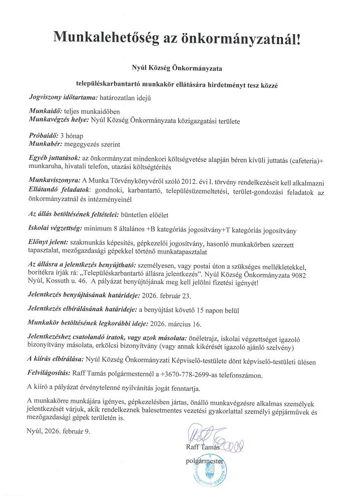 Nyúl Község Önkormányzata Településkarbantartó munkakör ellátására hirdetményt tesz közzé